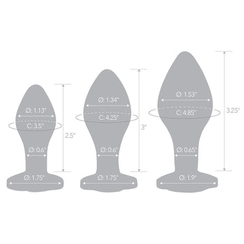 享受肛門插入樂趣的第一步是使用適合初學者的套件(例如 Heart Jewel Training Set)訓練臀部肌肉舒適地伸展。 後庭塞的尺寸包括 3.25''、3.5''和 4''。 每個塞的底座確保其安全,也可作為裝飾品。